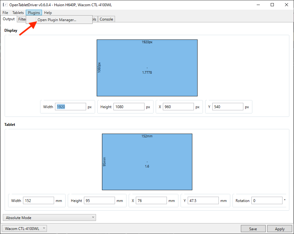 - Click both ‘Save’ AND ‘Apply’; if you do not click ‘Save’, OpenTabletDriver will not load OTD-IPC when it next starts