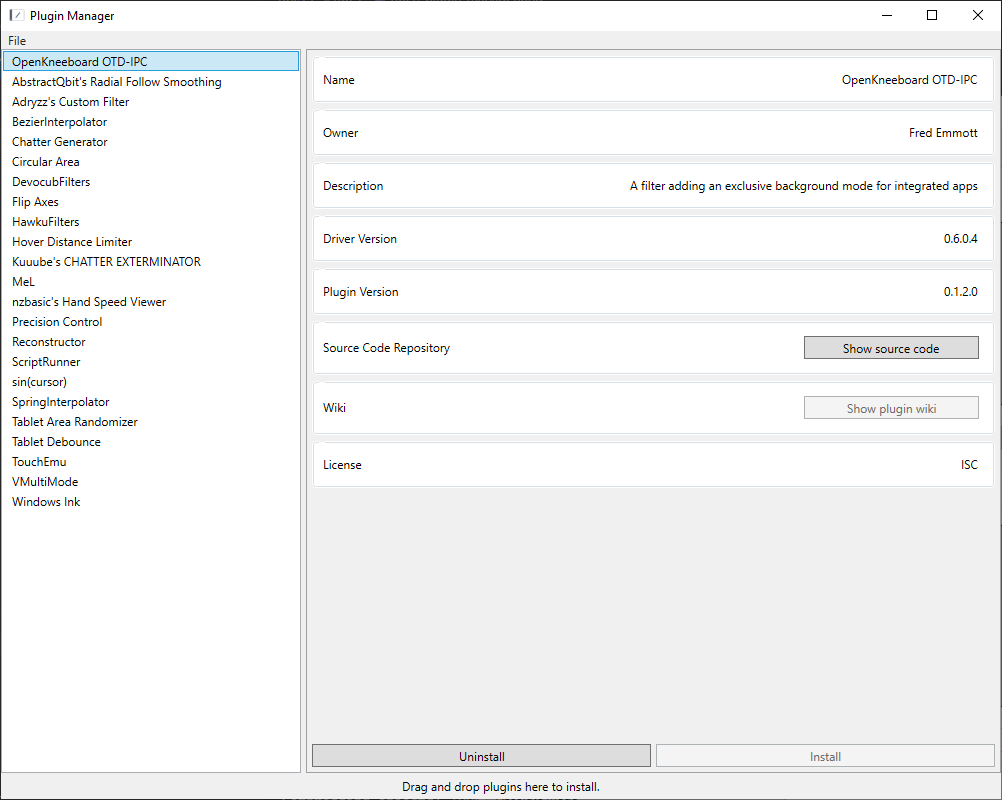 Drag-and-drop the OpenKneeboard-OTC-IPC .zip from your Downloads folder to the plugin manager Window; you should then see “OpenKneeboard OTD-IPC” in the list on the left, and when you click it, you should see something like this: